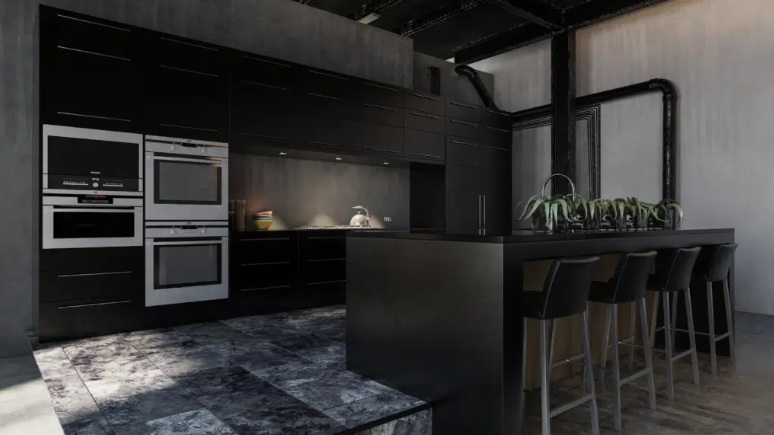 Using other materials is equally important to prevent the all-black kitchen from appearing too flat in the design. Materials like wood, stone, and brushed metals almost always invite extra visible complexity into the design.