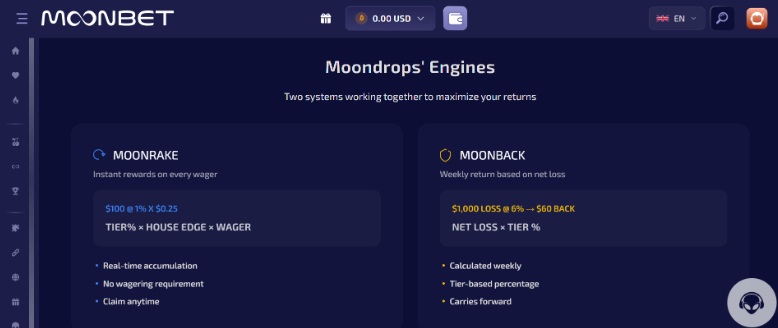 Moonbet pays you in cash. Moonrake puts 20% to 40% of the house edge back in your pocket on every bet. Moonback covers you when the week goes sideways. Both are withdrawable instantly with zero fees and zero wagering requirements.