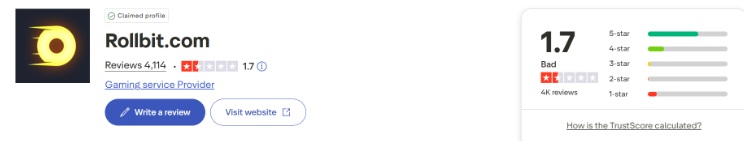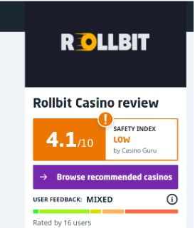 Rollbit has a 1.7/5 on Trustpilot from over 4,000 reviews. 40% are one-star. Casino Guru gives it a “Low” Safety Index of 4.1 out of 100 with 27+ unresolved complaints.