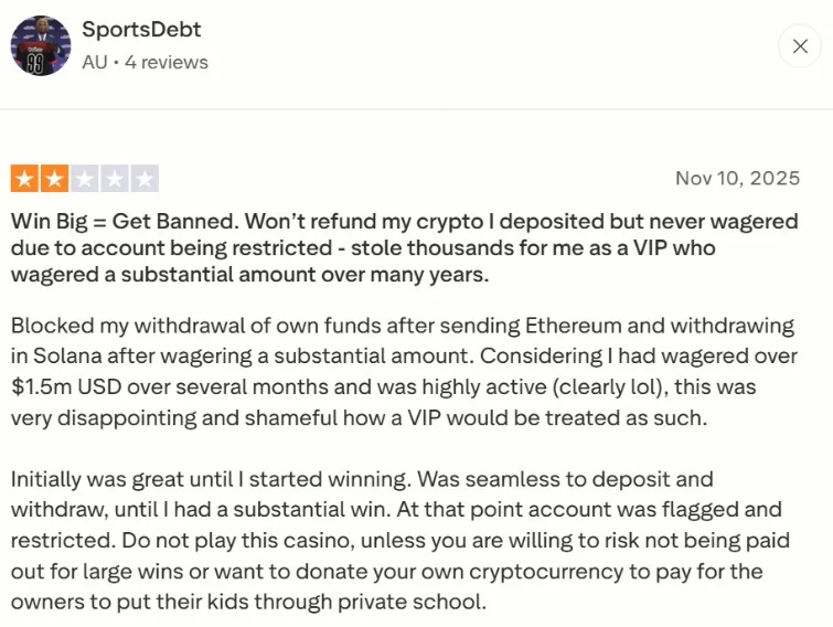 One Trustpilot review from a user named “SportsDebt” (November 2025) titled their post “Win Big = Get Banned.” They described wagering over $1.5 million USD over several months as a highly active VIP, only to have their withdrawal of personal funds blocked after sending Ethereum and withdrawing in Solana.