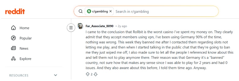 A Reddit user’s screenshot I reviewed showed something worse: two years of playing on Rollbit from Germany via VPN, zero problems. The moment they contacted support about a slot issue, they were banned. Germany is a “restricted country,” apparently, despite Rollbit accepting their deposits for 24 months straight.