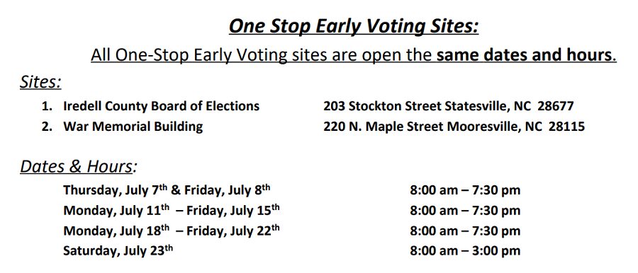 Early voting in the City of Statesville run-off election and the Town of Mooresville municipal elections continues Monday and runs through Saturday.