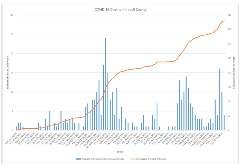 According to the Iredell County Health Department, the county’s COVID-19 death toll since the onset of the pandemic in March of 2020 now stands at 389. Local health officials do not release information on COVID-19 patients, including those who have passed away.