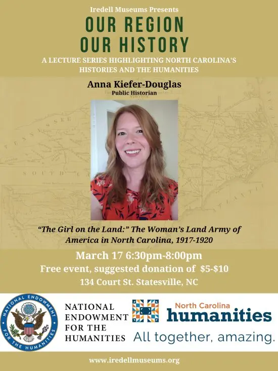 Anna Kiefer-Douglas will discuss “The Girl on the Land: The Women’s Land Army of America in North Carolina (1917-1920)” at Iredell Museums, located at 134 Court Street in Statesville, at 6:30 p.m.