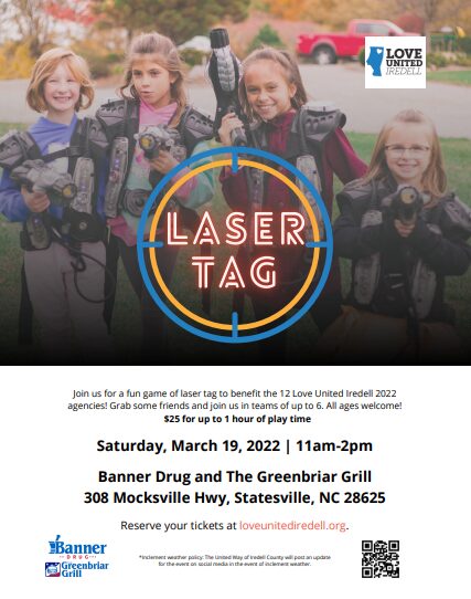 Purchase your tickets at www.LoveUnitedIredell.org by clicking on Laser Tag. Learn more about the 12 nonprofit agencies benefitting under the projects tab.