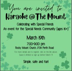 Rocky Mount Church is hosting a Karaoke @ The Mount event for special needs community members on Saturday, March 19, in the church’s large Boathouse room.