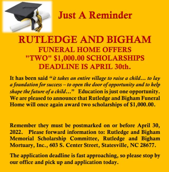 All material must be forwarded to: Rutledge and Bigham Memorial Scholarship Committee, Rutledge and Bigham Mortuary Inc., 603 S. Center Street, Statesville, NC 28677 and all applications must be postmarked on or before April 30, 2022.