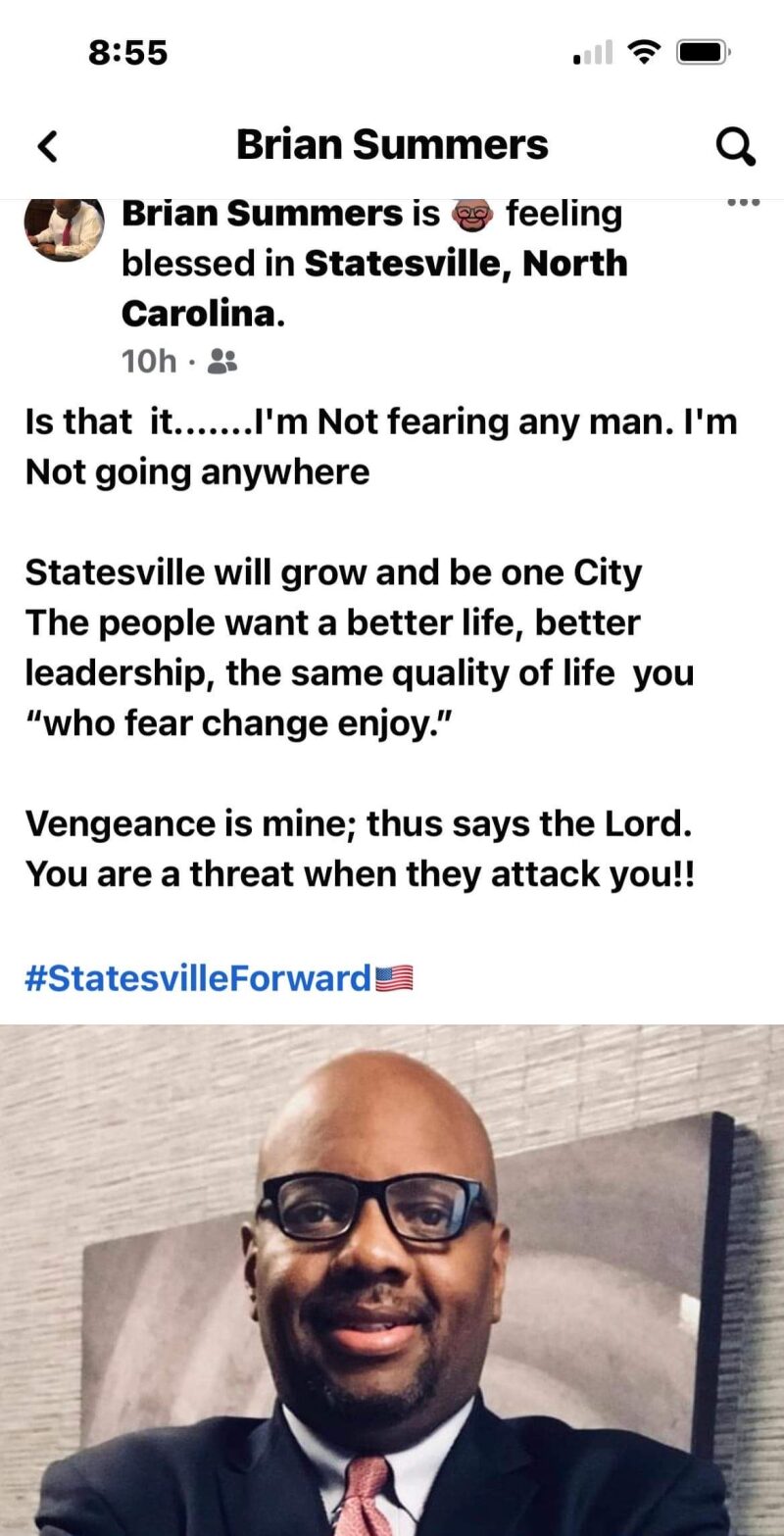 A day after his fitness to serve in public office was questioned in the Iredell Free News, Statesville mayoral candidate Brian Summers told his Facebook friends that he would not be deterred.