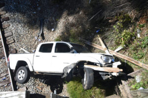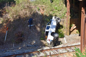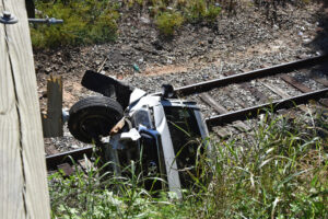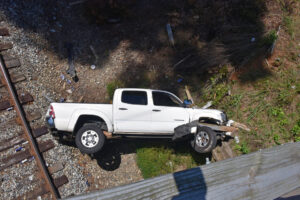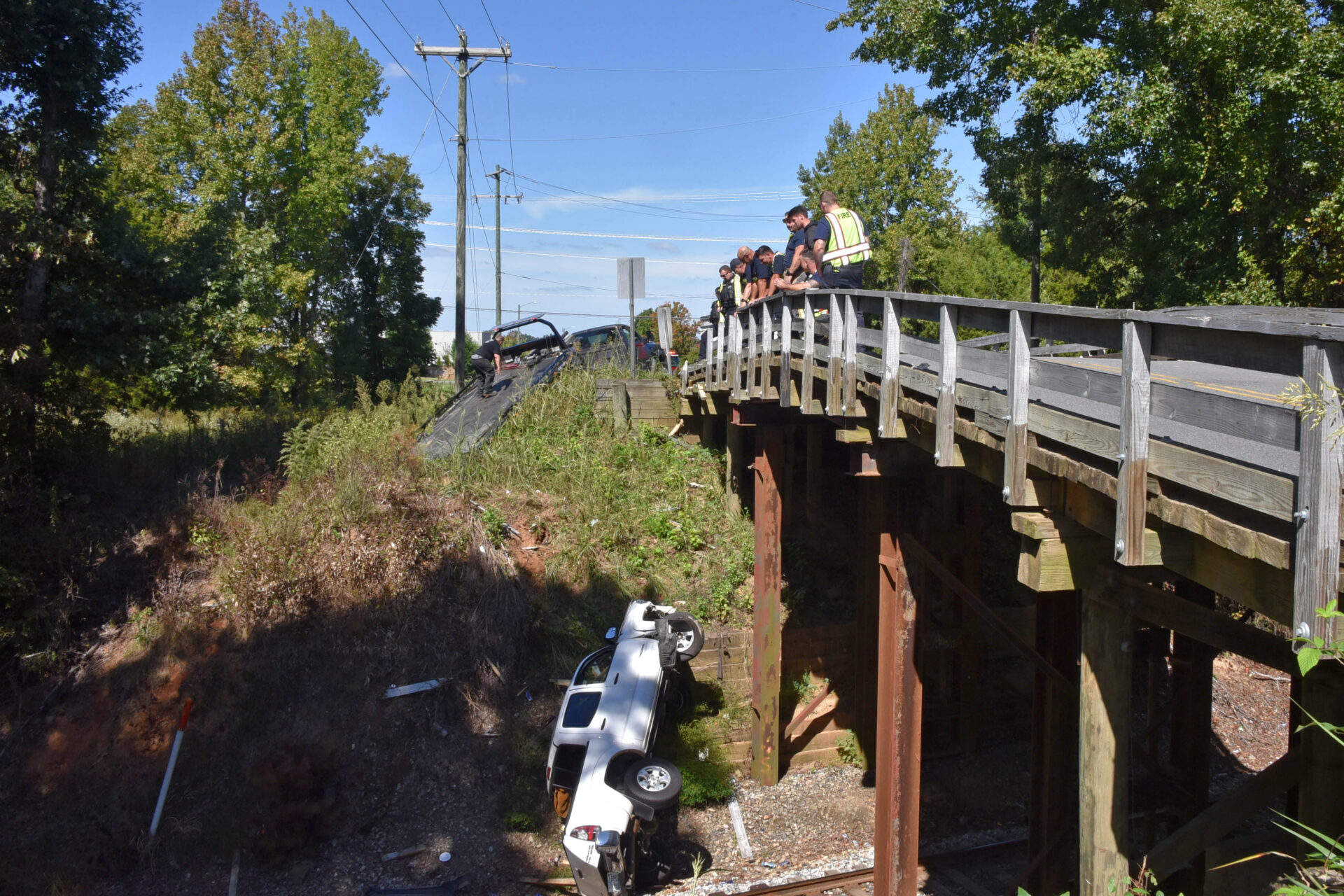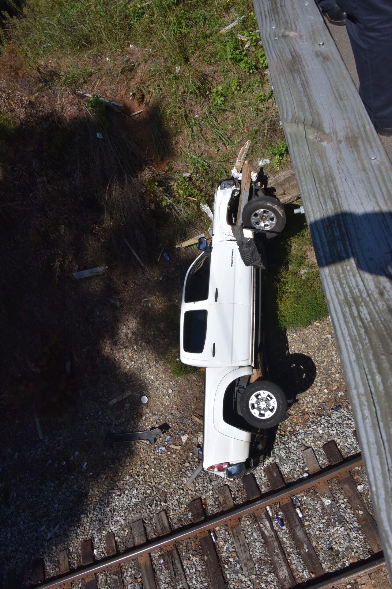 A passerby notified the firefighters about vehicle that driven off the Overhead Bridge Road bridge and onto the railroad tracks more than 20 feet below.