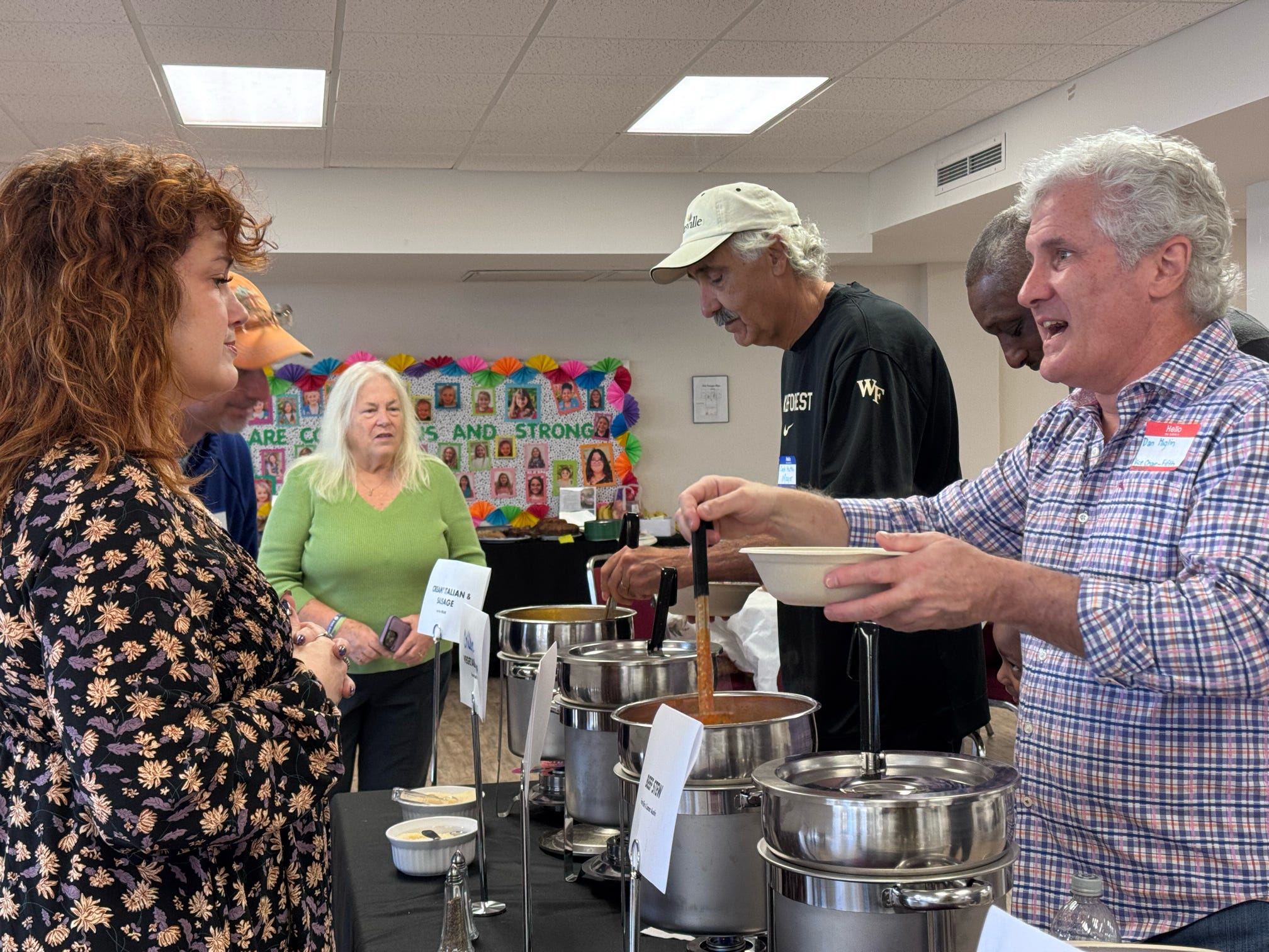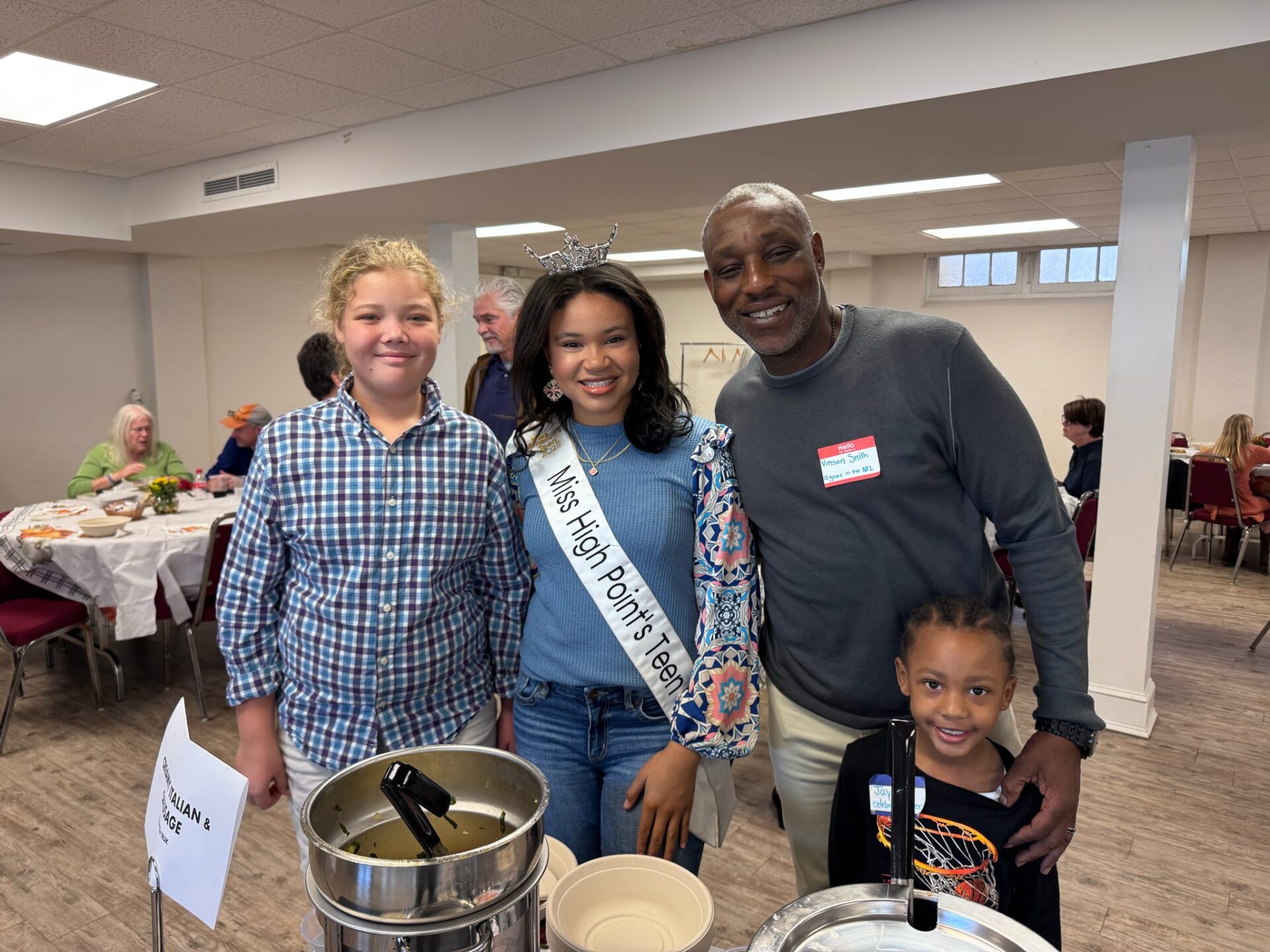 Empty Bowls is held each year at First Presbyterian Church in Statesville, where the congregation and youth group volunteer their time and energy, providing smiles and enthusiasm to this joyful experience. Soup was served by members of the Fifth Street board of directors as well as local celebrities, including Mayor Costi Kutteh, Mayor-elect Doug Hendrix and his wife Carol, former Dallas Cowboy Vinson Smith, Miss High Point Carrie Rader and Miss Teen Statesville Isabella DiFiore.