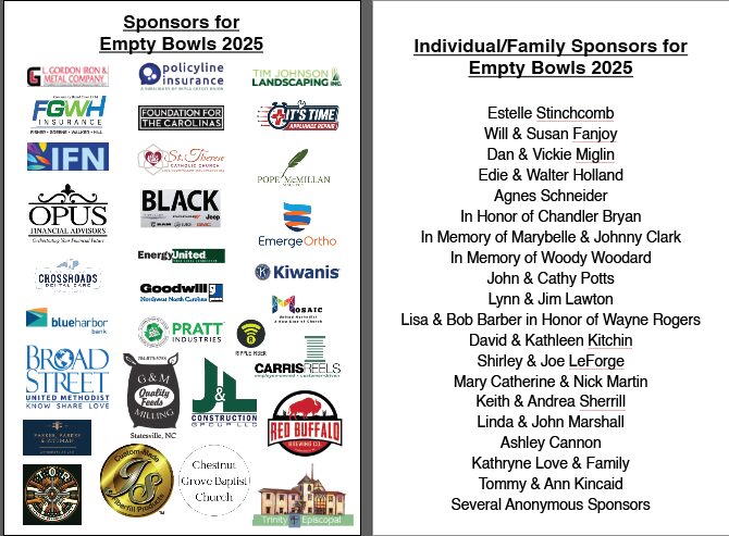 As in previous years, bowls lovingly crafted by Gin Scott and local artists at CrEate Pottery Studio in Statesville were handed out to guests. Tickets included the option for selecting your choice of artisan bowl to take home, providing a lasting reminder of how sharing a meal with our neighbors and supporting one another can provide hope to our neighbors in need.