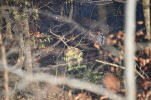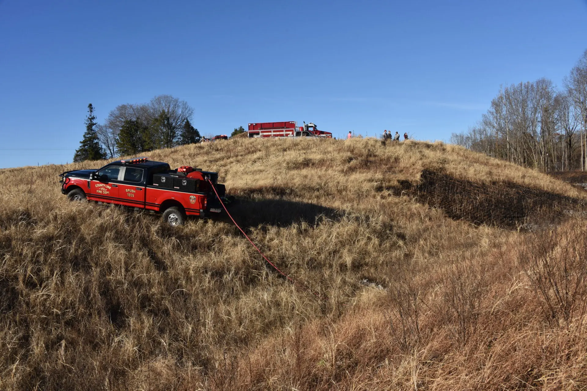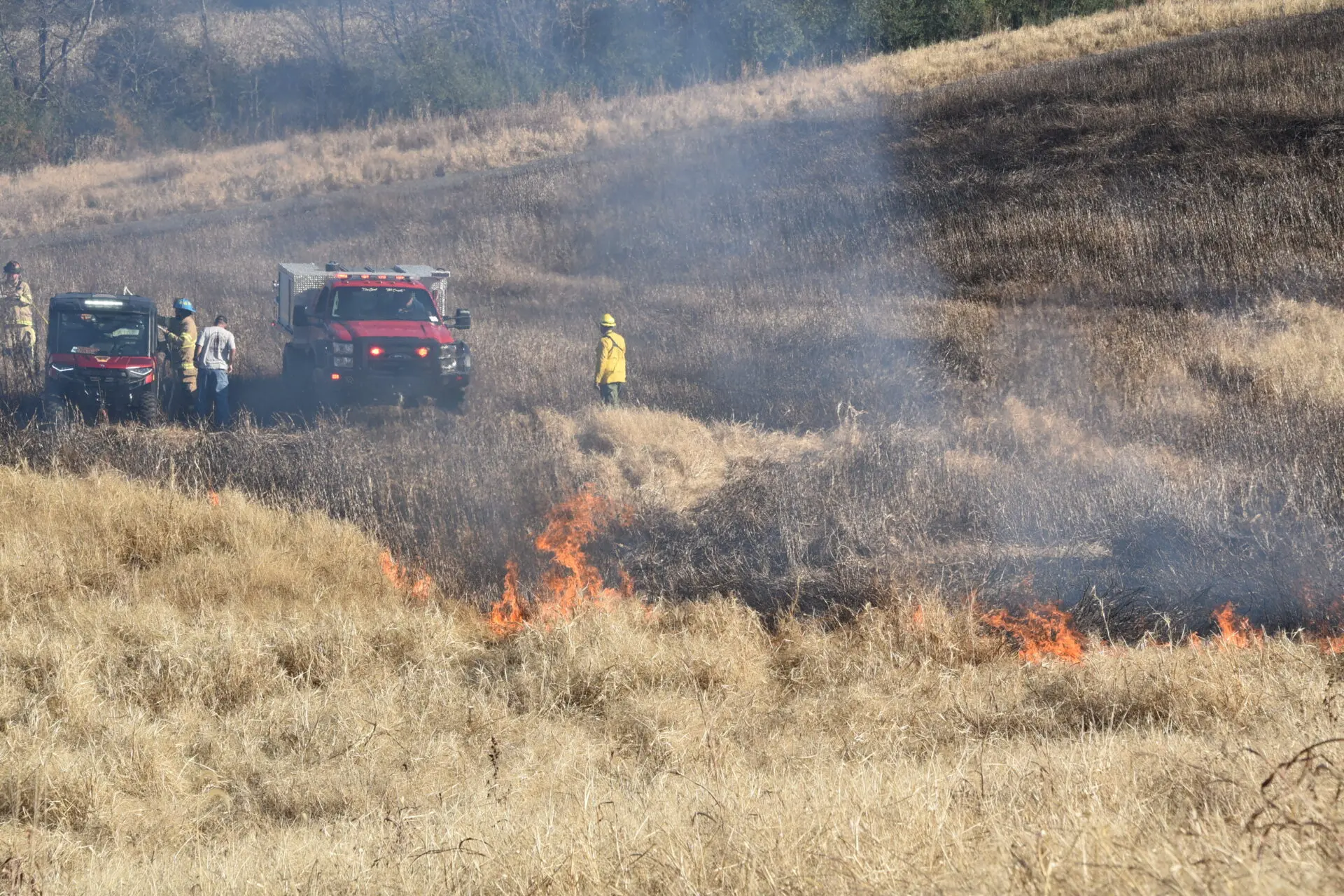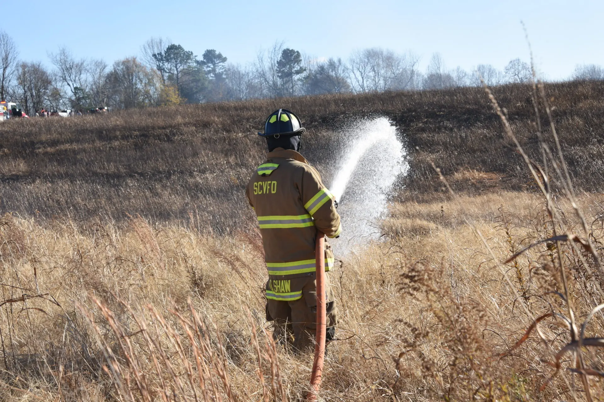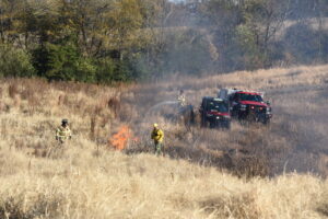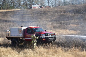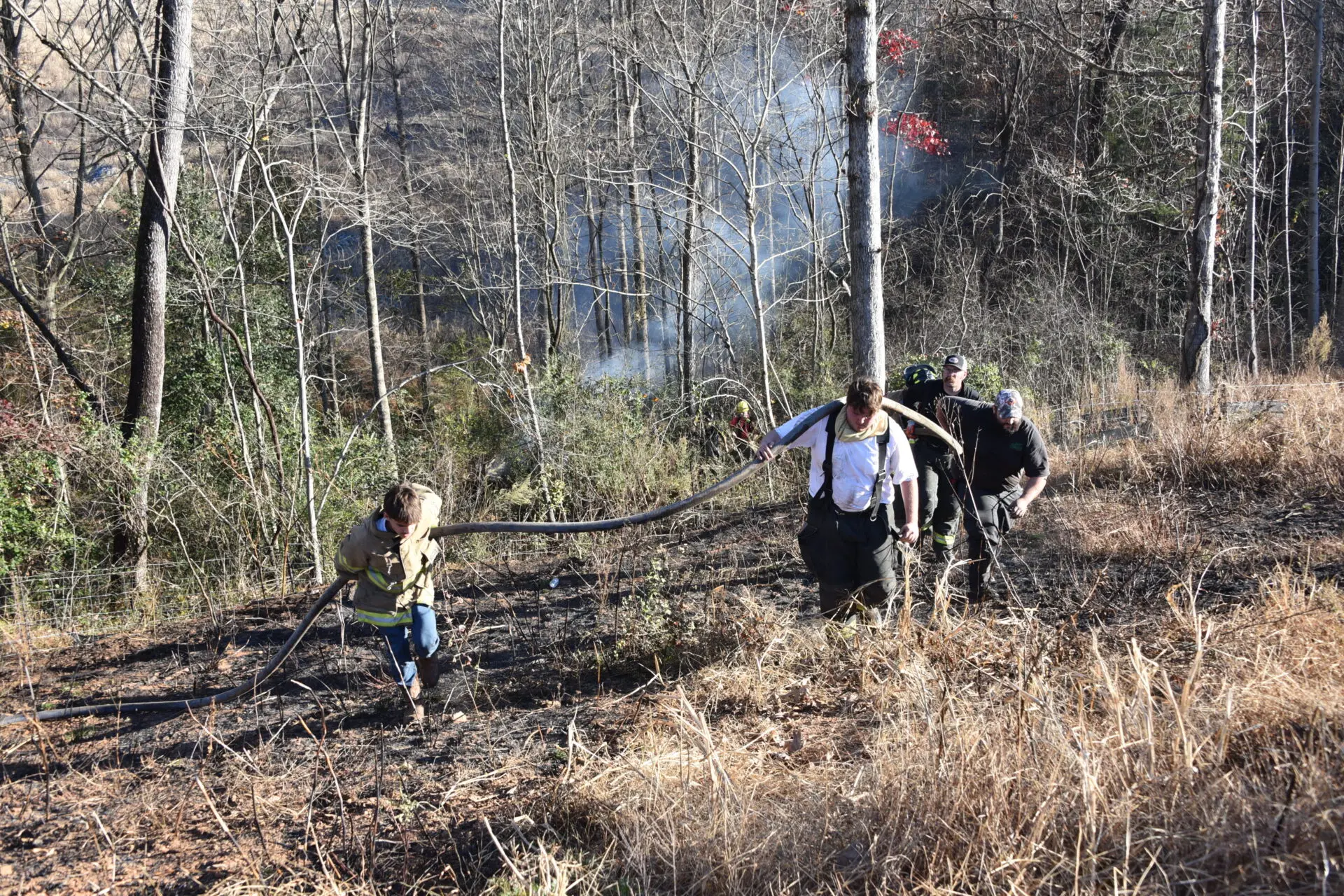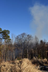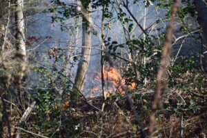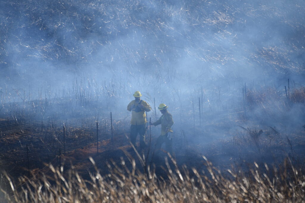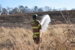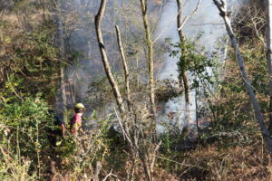 Firefighters battled the blaze, which consumed over 25 acres, and prevented it from burning a structure. The fire was placed under control at 4:31 p.m. Crews remained on the scene for hours hitting hot spots. No injuries were reported. The Forestry Service is investigating the cause.