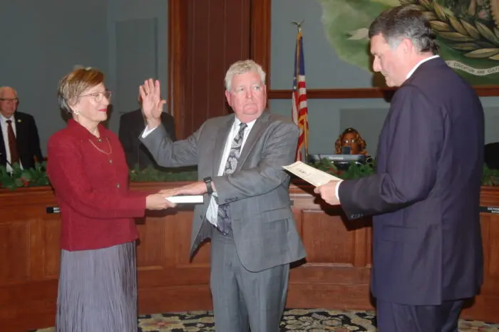 Councilman and Mayor Pro Tem David Jones then opened a new session for the swearing in of Hendrix, who was accompanied by his wife Carole, as mayor.