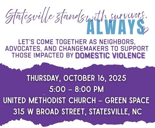 Neighbors, advocates, and community partners will gather in Downtown Statesville on October 15 for a free Community Awareness & Resource Fair, reaffirming a shared commitment to stand with survivors of domestic violence always.