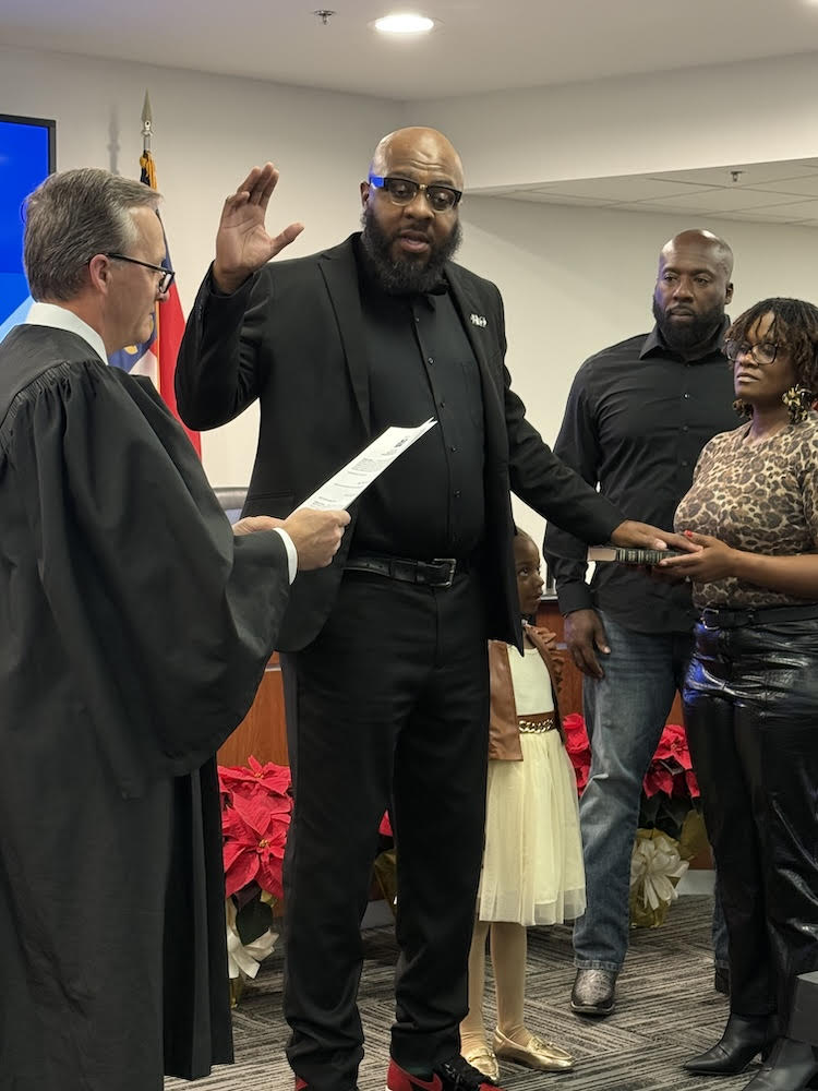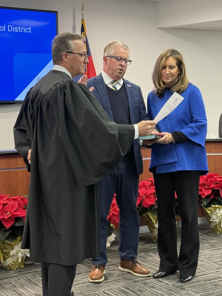 Greg Whitfield and Rakeem Brawley were sworn in for another term on the Mooresville Graded School District School Board of Education on Wednesday night by Superior Court Judge Troy J. Stafford.