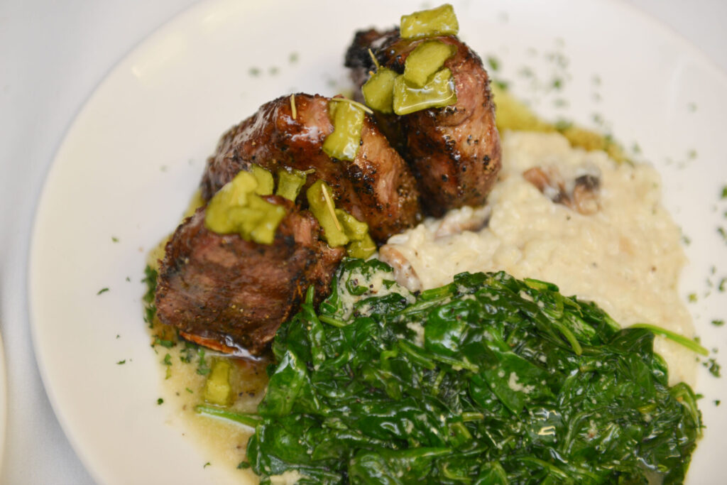 The menu changes seasonally and often includes locally sourced ingredients. Current offerings include the N.C. Cheshire Pork Chop, Joyce Farms Airline Chicken Breast, and Lucky Leaf micro greens.