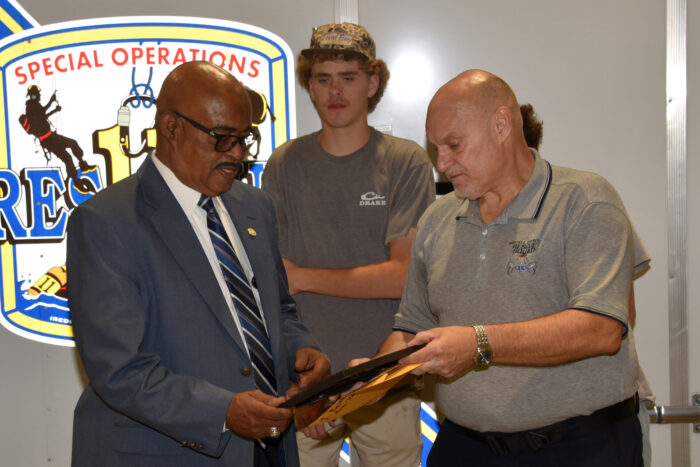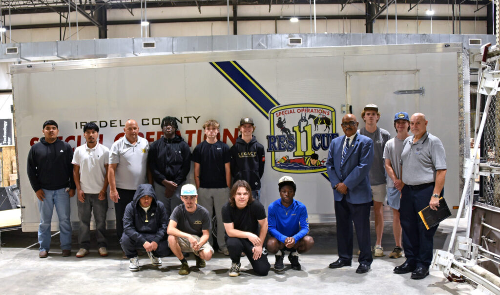 Iredell County Rescue Squad Assistant Chief Tim Barber presented a Certificate of Appreciation and a check to cover the cost of materials to Career Academy and Technical School Principal Larry Rogers. Led by instructor Jeff Balthaser, construction class students were instrumental in building wooden cabinets and a desk for use at rescue scenes. The trailer will be used to transport swiftwater, confined space and large animal rescue equipment to scenes when needed. The Rescue Squad is grateful for the assistance CATS has provided.