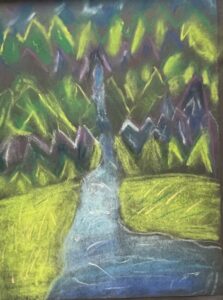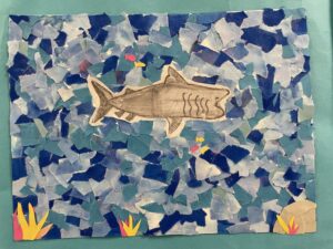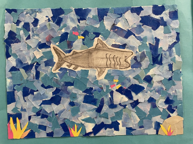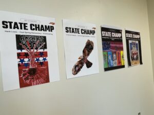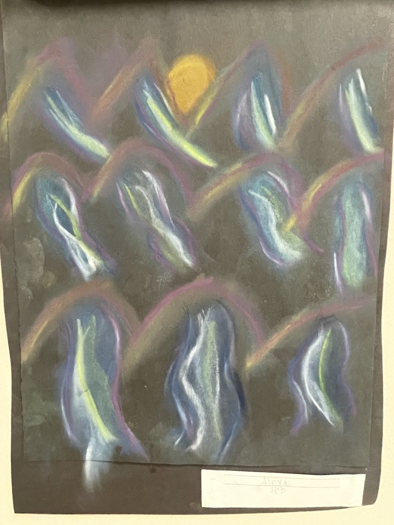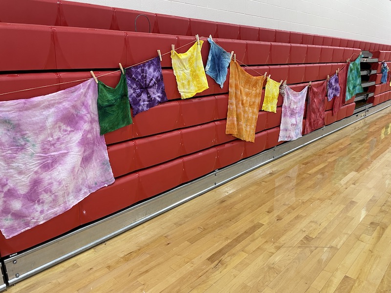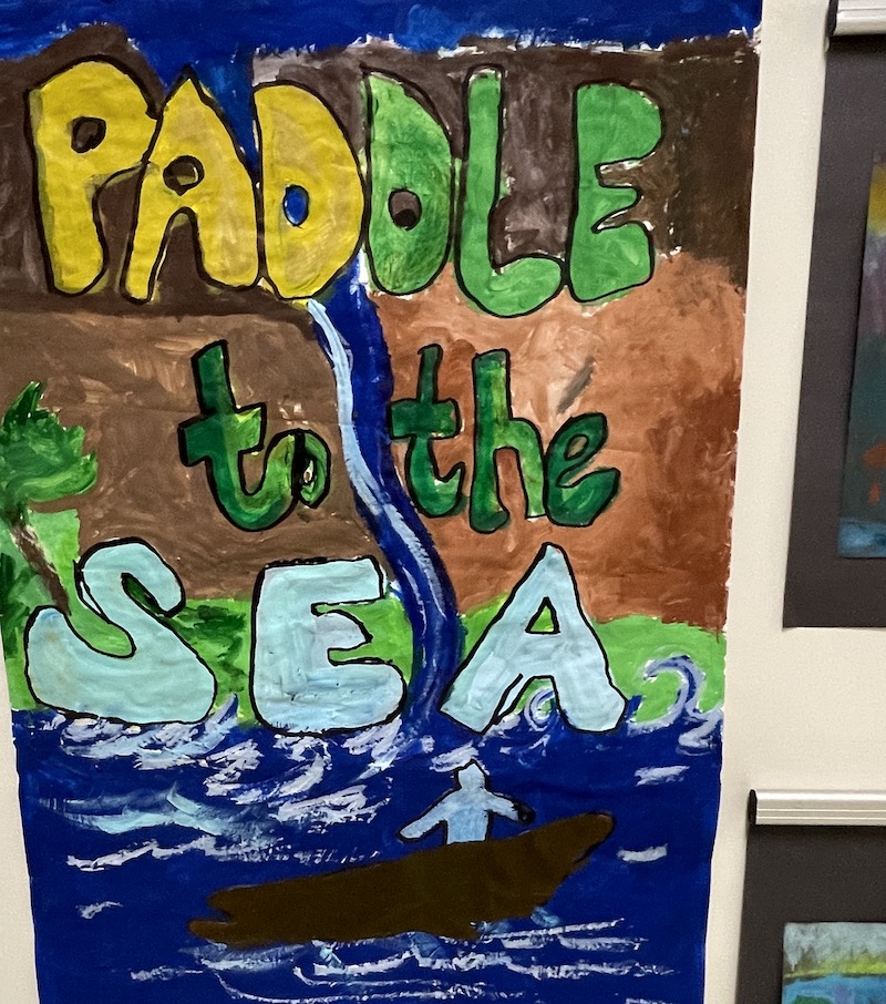 The artwork included fiber art hung alongside mixed media pieces. Printmaking projects lined the walls. Traditional Japanese Shibori tie-dye added bursts of pattern and color, while younger students explored movement through displays like the first-grade “Paddle to the Sea” installation.