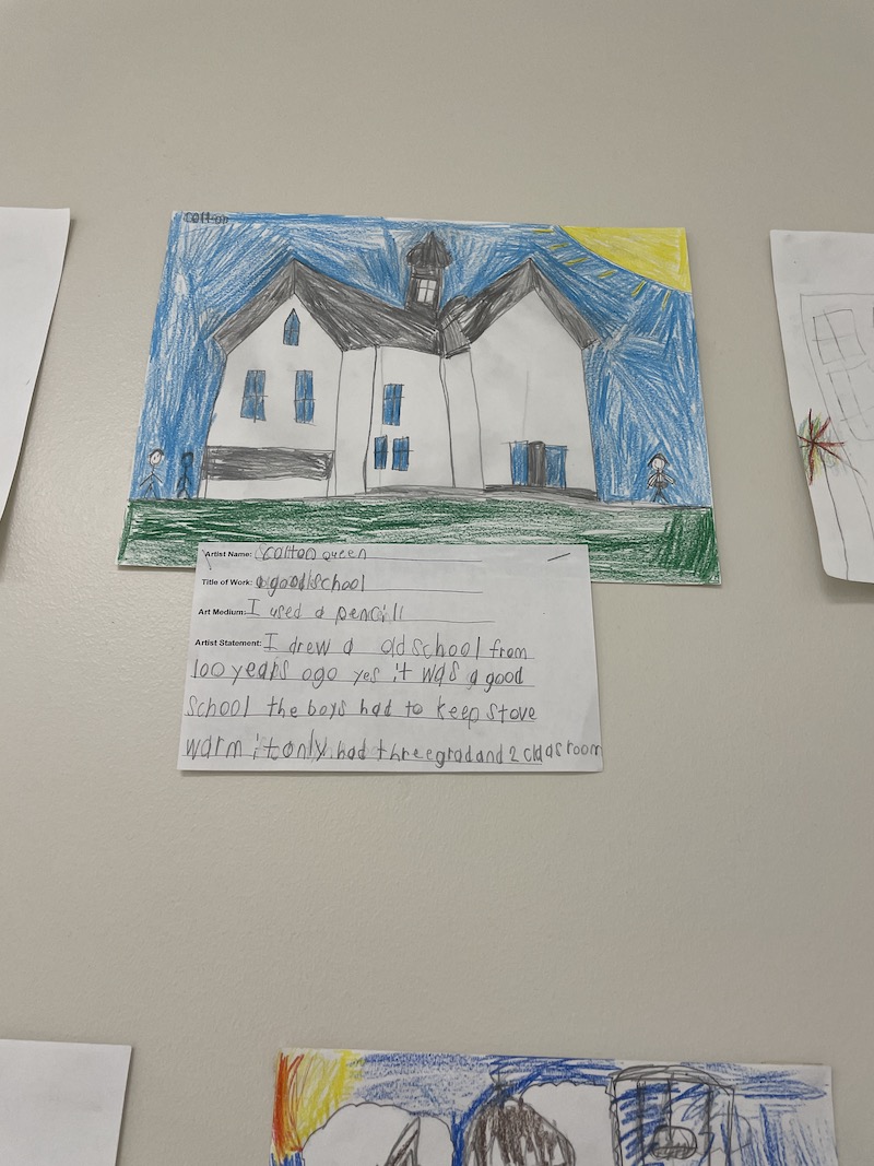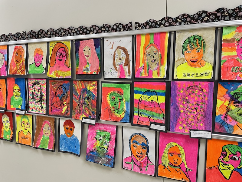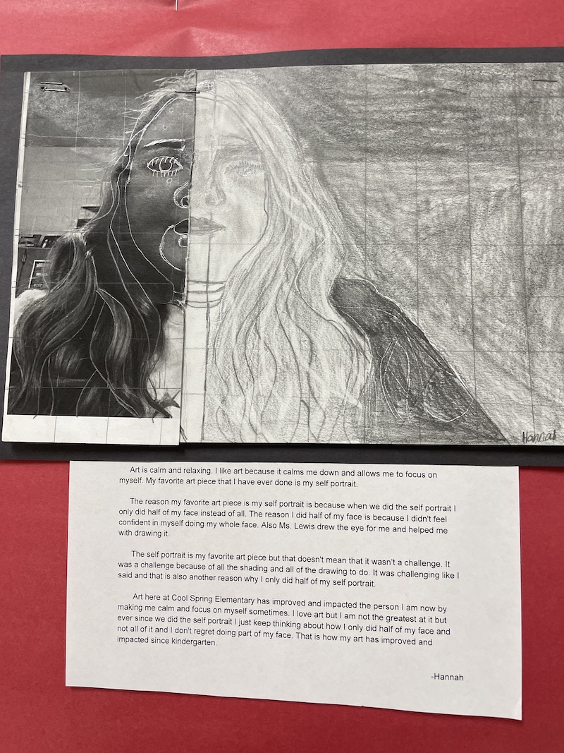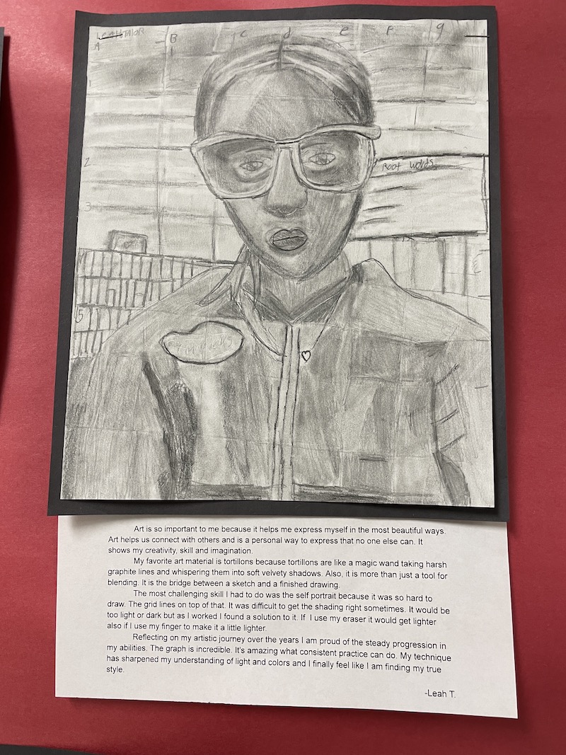 Students documented their creative journeys through “See, Think, Wonder” sketchbooks, capturing both process and imagination. Fifth-graders demonstrated technical skill through detailed self-portraits created using the grid method. Students also received helped from their English teachers to write about their portraits.