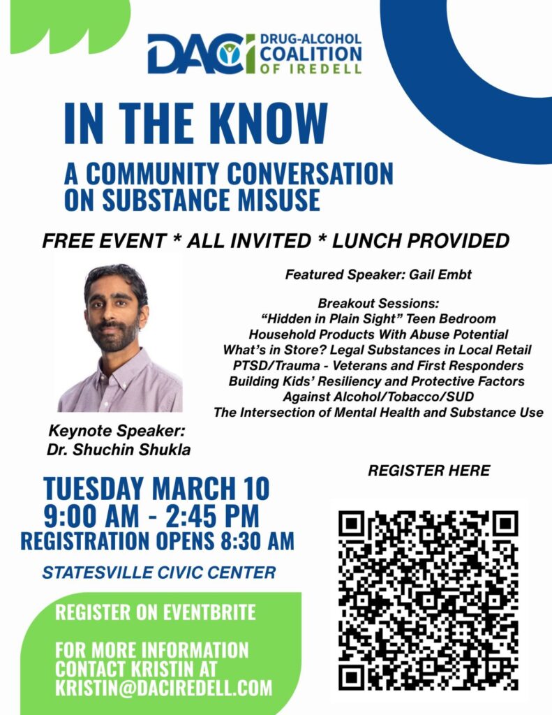 The Drug-Alcohol Coalition of Iredell (DACI) will present its annual “In The Know: A Community Conversation on Substance Misuse” event on Tuesday, March 10, at the Statesville Event Center.