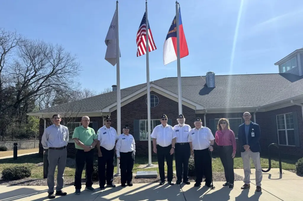 Hospice & Palliative Care of Iredell County held a meaningful first flag raising ceremony on March 6 at the S. Mitchell Mack Hospice House in Mooresville to commemorate the installation of new flagpoles on the property for the first time since the facility opened.