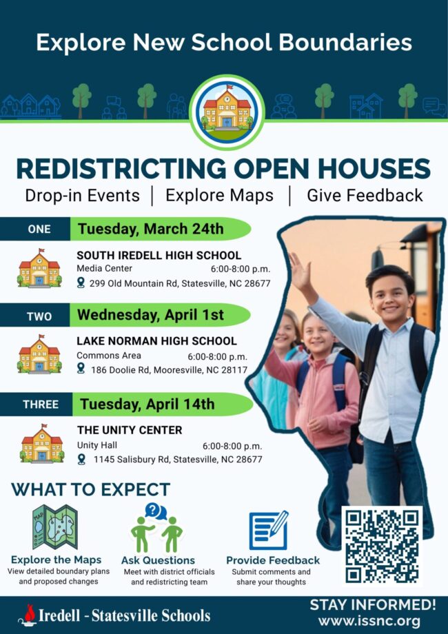 Iredell-Statesville Schools on Thursday announced plans for a series redistricting open houses. With the opening of Weathers Creek High School and Parkertown Elementary School on the horizon, district officials are reworking district boundaries for several schools. The new schools are set to open in time for the 2027-2028 years.