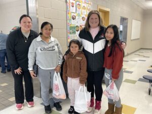 The children were happy to see the staff and talk about playing in the snow. The mom expressed appreciation as she carried their bags of food out of the cafeteria.