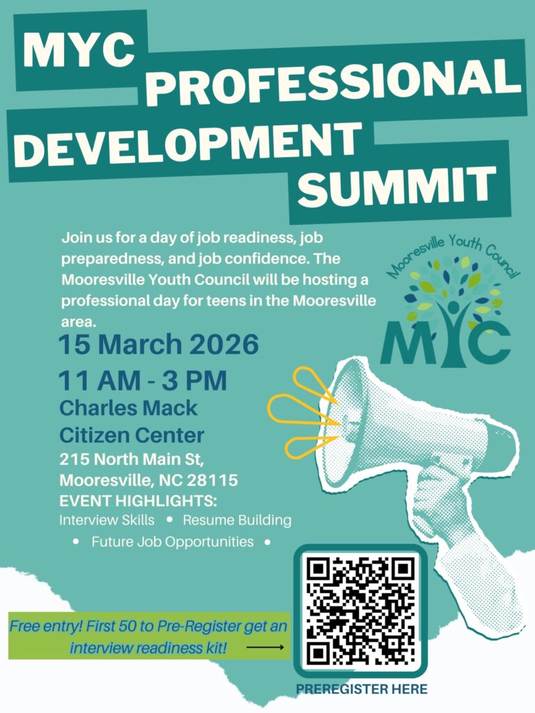 The Mooresville Youth Council invites teens in the community to Downtown Mooresville for a free event full of activities that will prepare them for the future. The “Professional Development Summit” will take place on Sunday, March 15, from 11 a.m. to 3 p.m., at the Charles Mack Citizen Center.