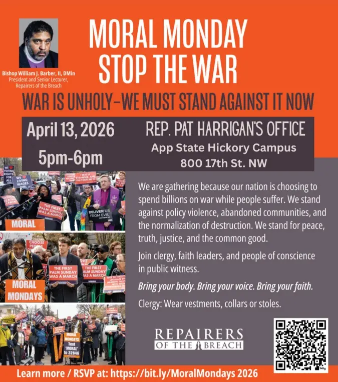 A coalition of clergy, veterans, and moral leaders are planning to convene outside Rep. Pat Harrigan’s district office on the App State campus in Hickory at 5 p.m. on Monday, April 13. Through public prayer and testimony, participants will demand that Congress cease funding unauthorized military action in the Middle East and instead invest in the social safety net programs that protect poor and working people.