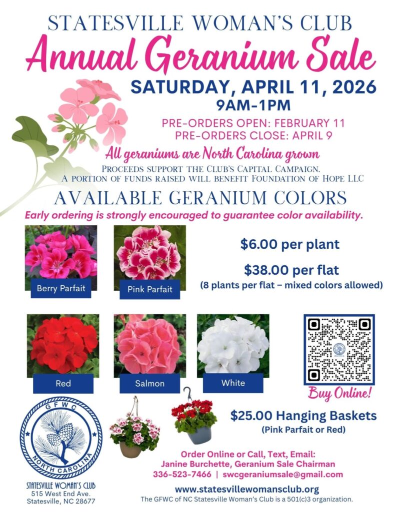 The Statesville Woman’s Club is now taking orders for the Annual Geranium Sale that will be held on Saturday, April 11, from 9 a.m. to 1 p.m.