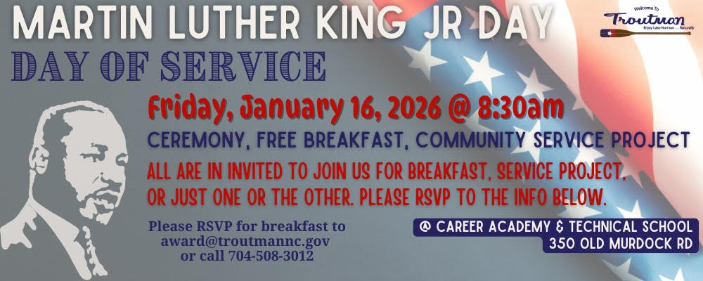 The last day to register for the Martin Luther King Jr. Day breakfast and community service project is on Wednesday, January 7. Email award@troutmannc.gov or call 704-508-3012 to RSVP.